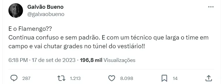 “E o Flamengo?? Continua confuso e sem padrão. E com um técnico que larga o time em campo e vai chutar grades no túnel do vestiário”, disse Galvão Bueno, em suas redes.