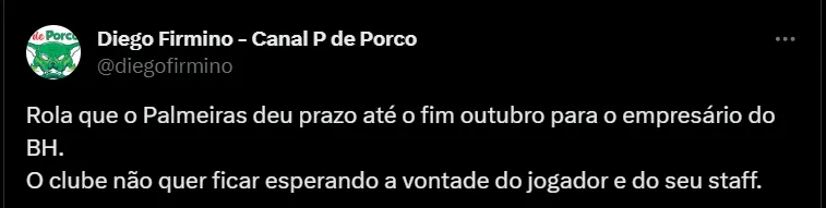 De acordo com as informações publicadas pelo jornalista Diego Firmino, que acompanha o dia a dia do Verdão, existem conversas que o Palmeiras definiu até o fim de outubro para saber a resposta de Bruno Henrique, já que não quer ficar esperado a sua vontade.