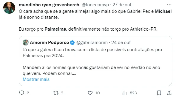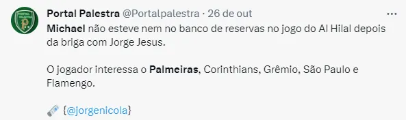 Desta forma, no Brasil, o Palmeiras aparece como um dos principais interessados. O Verdão busca um atacante de lado e, de acordo com Jorge Nicola, Michael é alvo.