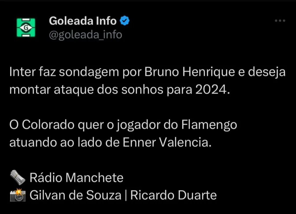 O Inter deseja formar uma dupla de ataque dos sonhos com Enner Valencia e Bruno Henrique para a próxima temporada. Além do Internacional, Atlético-MG e Palmeiras são os principais interessados no atacante do Flamengo.