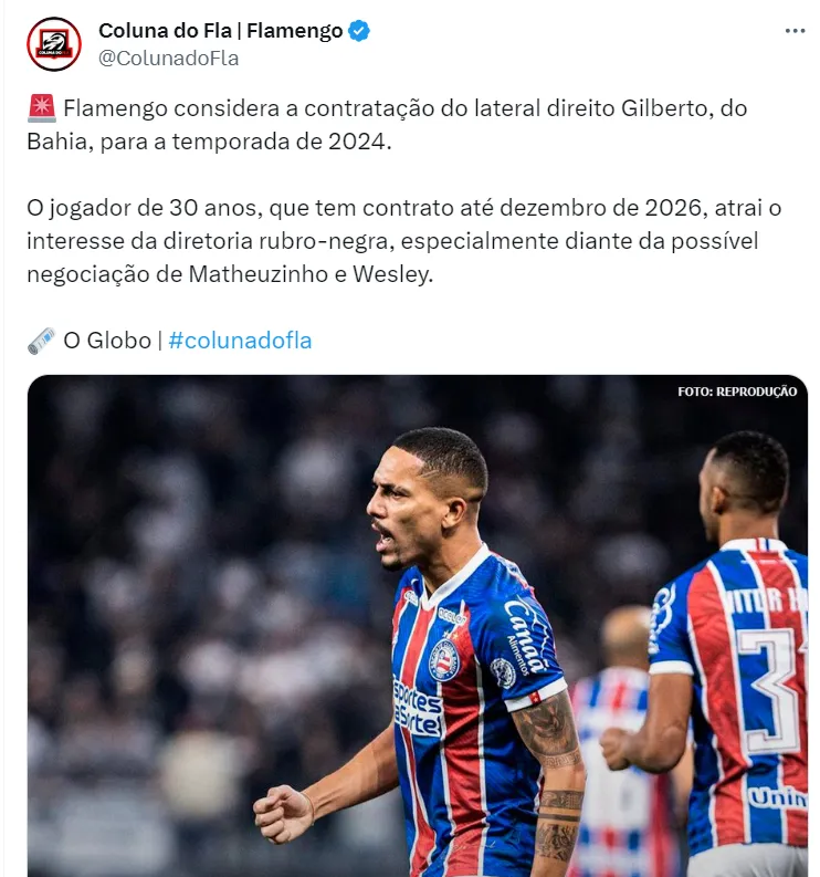 Todavia, o Bahia pode ver seu grande defensor no Flamengo em 2024. Isso porque, de acordo com informações do O Globo, o clube carioca sondou a situação do jogador pensando no próximo ano.