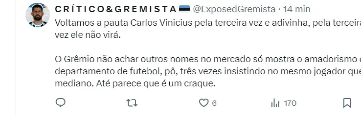 De acordo com informações de Kaliel Dorneles, o Grêmio iniciou as primeiras tentativas em busca de um acordo por Carlos Vinicius. O estágio é inicial, mas Carlos tem o desejo de jogar no Brasil. Jogar com Renato Portaluppi é uma opção apesar da pressão que vive o treinador.