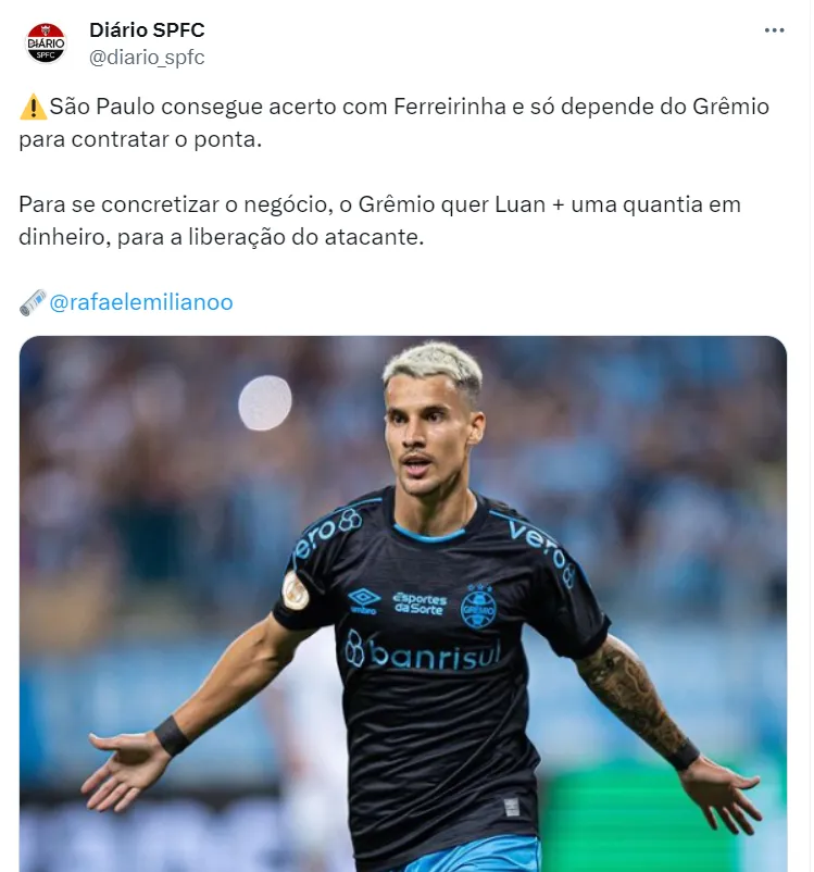 De acordo com informações do jornalista, Ferreirinha já está acertado para jogar no time de Dorival em 2024, mas ainda depende de um acordo total com o Grêmio que, para liberá-lo, pede Luan e uma compensação financeira.