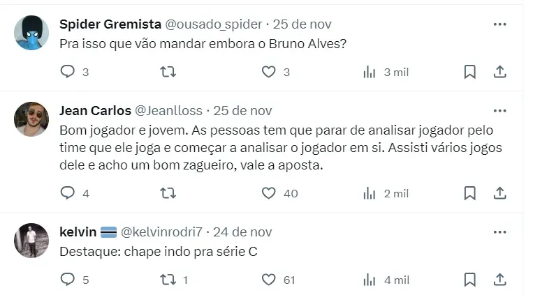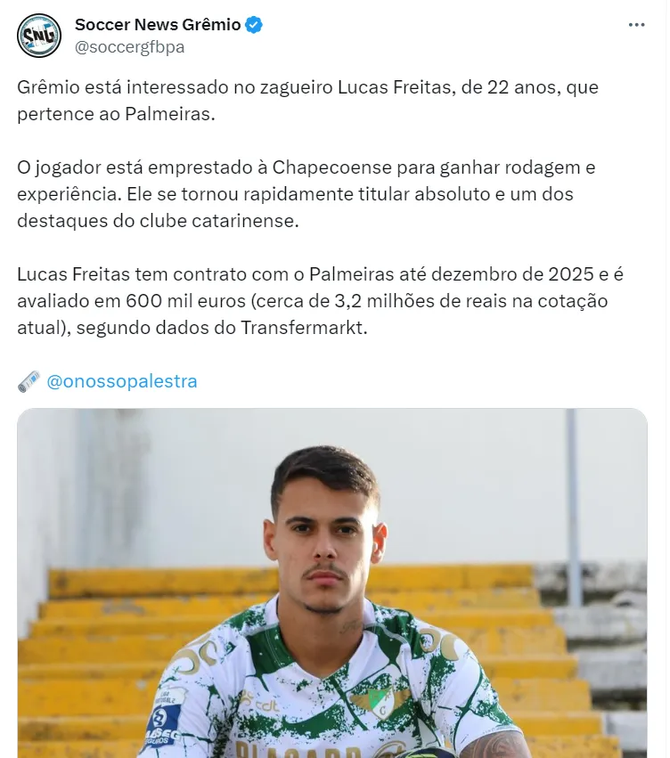 “Bruno Alves não terá seu contrato renovado e o Grêmio viu no Lucas Freitas alguém que pode dar conta do recado. O contrato de Lucas Freitas com o Palmeiras é válido até dezembro de 2025”, completa.