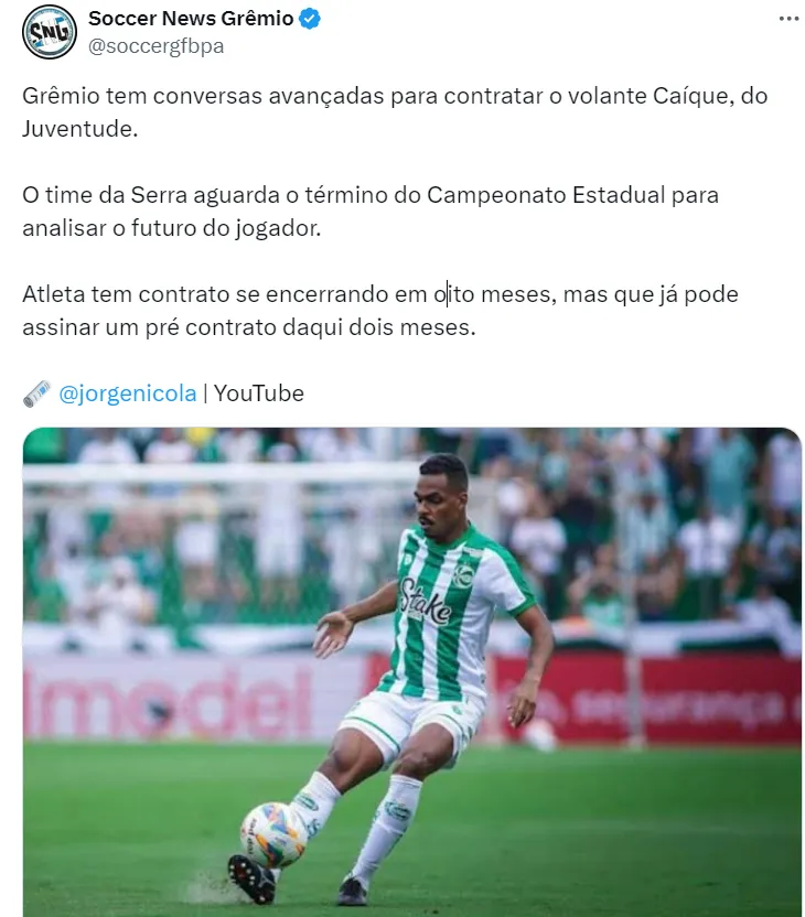 Informações do jornalista Jorge Nicola dão conta de que o Grêmio tem conversas avançadas para fechar a contratação do volante Caíque, do Juventude, para a temporada brasileira.