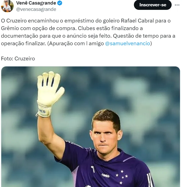 O goleiro Rafael está deixando o Cruzeiro para ser o novo reforço do Grêmio, informa Venê Casagrande, juntamente com Samuel Venancio. O Tricolor Gaúcho corre contra o tempo para oficializar a contratação do jogador.