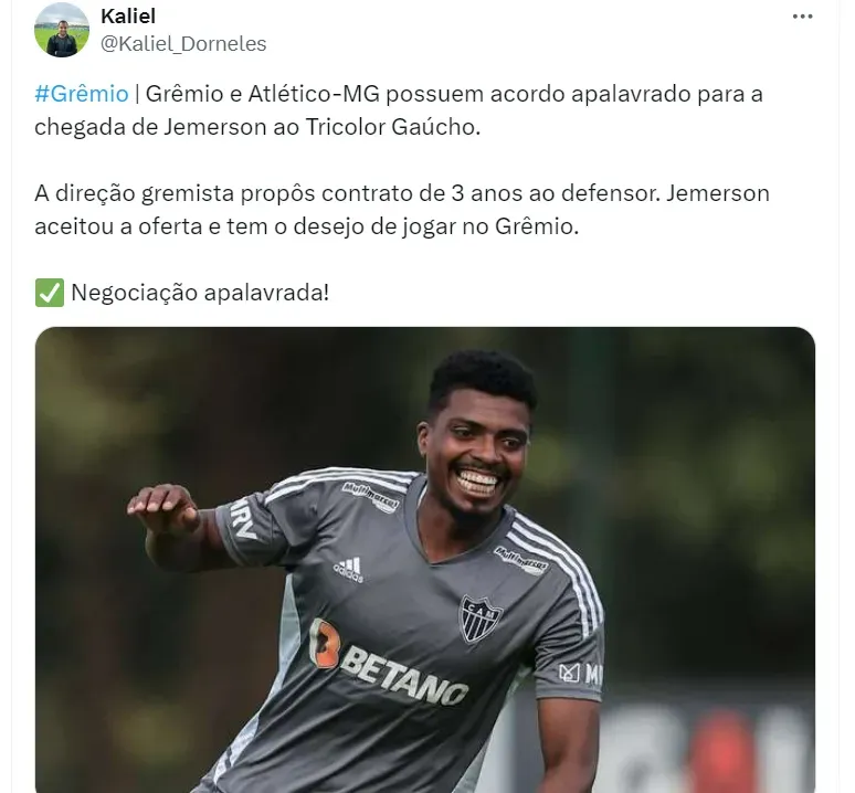 Outro zagueiro que está apalavrado com o Grêmio, é Jemerson, do Atlético-MG, segundo informa Kaliel. Há um acordo de três anos entre as partes, restando apenas detalhes para o anúncio oficial.