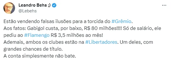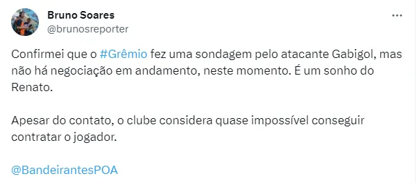 Agora, em seu canal do YouTube, Alex Bagé resolveu falar sobre o assunto. A fonte revela que é bastante improvável que Gabigol troque o Flamengo pelo Grêmio.