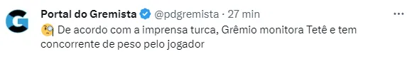 Isso porque, de acordo com o portal Fotomaç, da Turquia, o Grêmio, assim como o Palmeiras, está de olho na possibilidade de fechar com o ponta Tetê, que pertence ao Galatasaray.