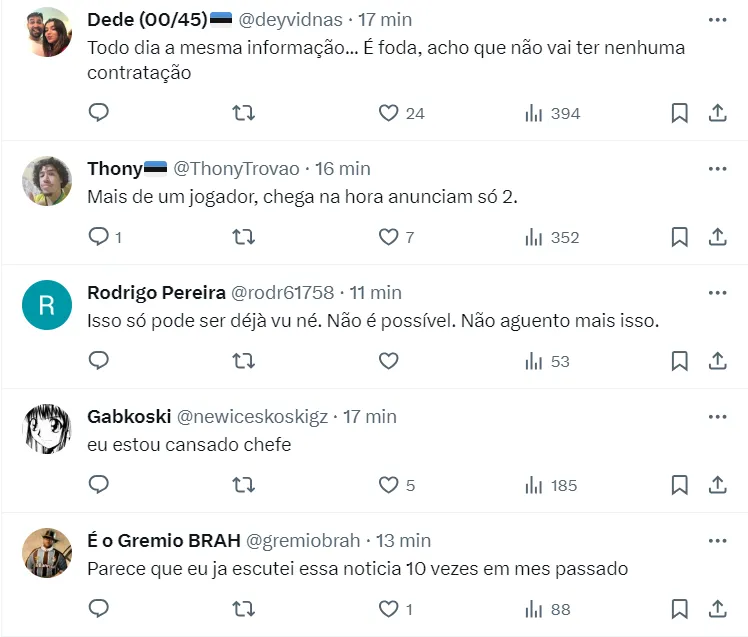 Nomes, por sua vez, ainda são desconhecidos da torcida, que se mostra bastante insatisfeita nas redes sociais com a falta de contratações da diretoria na temporada brasileira.