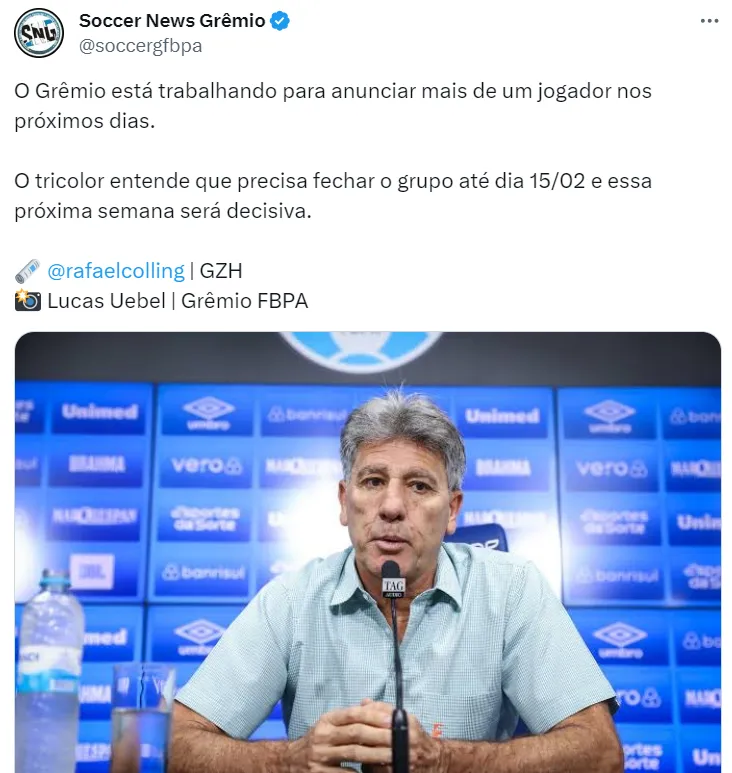 Enquanto procura por um camisa 9 de qualidade, Rafael Colling informou que o time de Renato está trabalhando para anunciar a contratação de mais de um jogador nos próximos dias. Segundo a fonte, a ideia é fechar o elenco até o dia 15.