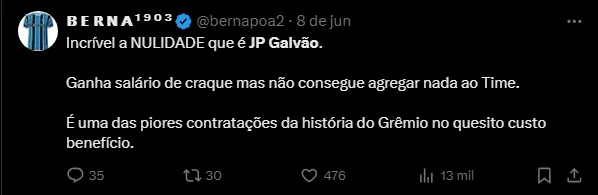 O número de gols marcados pelo centroavante representa apenas 2,1% dos 69 gols marcados pelo Grêmio na temporada. Vale destacar que JP Galvão chegou no fim de 2023, onde disputou 15 jogos e não marcou nenhum gol.