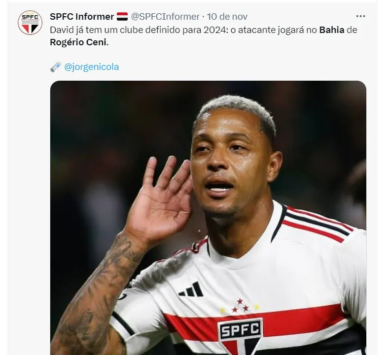 De acordo com Jorge Nicola, o atacante David, do Internacional, e que está emprestado para o São Paulo, jogará no Bahia em 2024. A fonte não entra em maiores detalhes, mas frisa que o acordo irá acontecer.