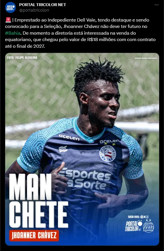 De acordo com as informações publicadas pelo jornalista Rodrigo Barata, do Canal Bara Bahia, o Grupo City não deve contar com o lateral-esquerdo Jhoanner Chávez para 2024 e pode vender o atleta.