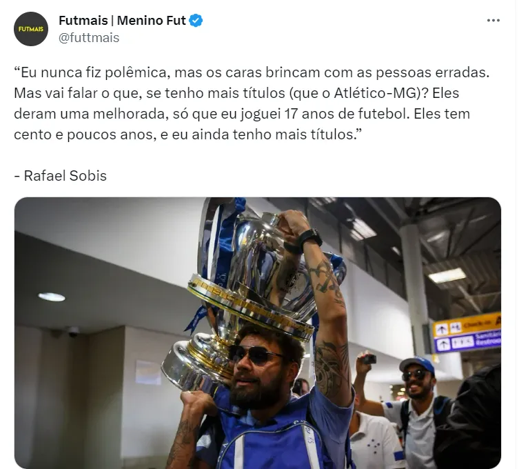 “Eu nunca fiz polêmica, mas os caras brincam com as pessoas erradas. Mas vai falar o que, se tenho mais títulos (que o Atlético-MG)? Eles deram uma melhorada, só que eu joguei 17 anos de futebol. Eles tem cento e poucos anos, e eu ainda tenho mais títulos”, disse Sobis, provocando o Atlético MG.