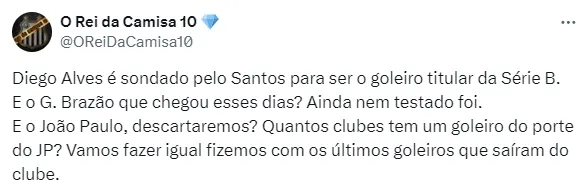Isso porque, de acordo com JV Cavalheiro, Diego Alves, apesar de não ser a prioridade, é um dos nomes avaliados pelo Santos para a disputa da Série B do Brasileirão.