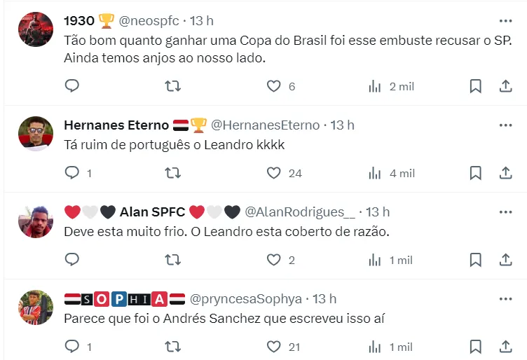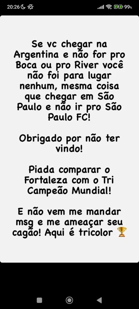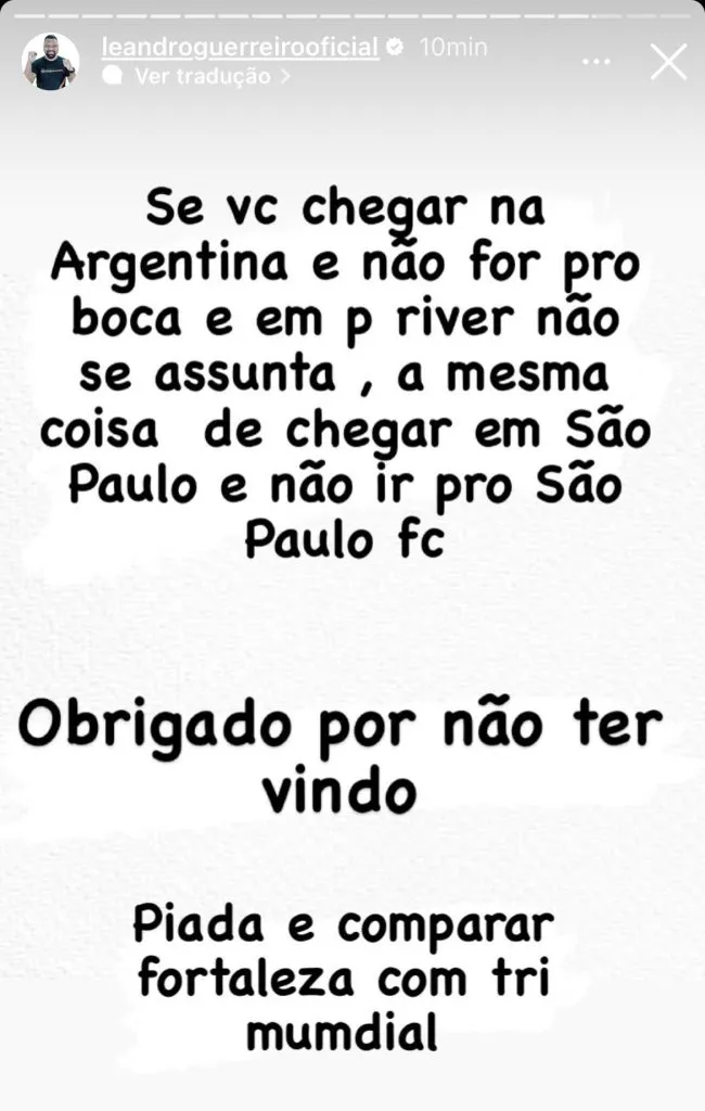 “Piada comparar o Fortaleza com o tricampeão mundial. E não vem me mandar mensagem e me ameaçar, seu cagão. Aqui é tricolor”, finaliza Leando Guerreiro, ídolo do São Paulo.