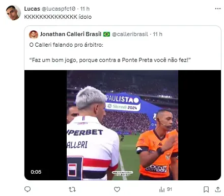 Fabiano Monteiro apitou o jogo entre Ponte Preta e São Paulo, partida que o time de Campinas venceu por 2 a 0. A atuação do árbitro gerou insatisfação por parte de alguns jogadores do Tricolor e Callerii resolveu expor ao árbitro sua insatisfação. Vale lembrar que o atacante recebeu cartão amarelo contra a Inter de Limeira e está de fora do clássico contra o Palmeiras.
