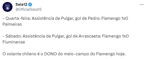 Enquanto isso, Pulgar segue jogando pelo Fla. O jogador também é peça fundamental para a seleção do Chile, somando quatro gols em 47 jogos pelo país.