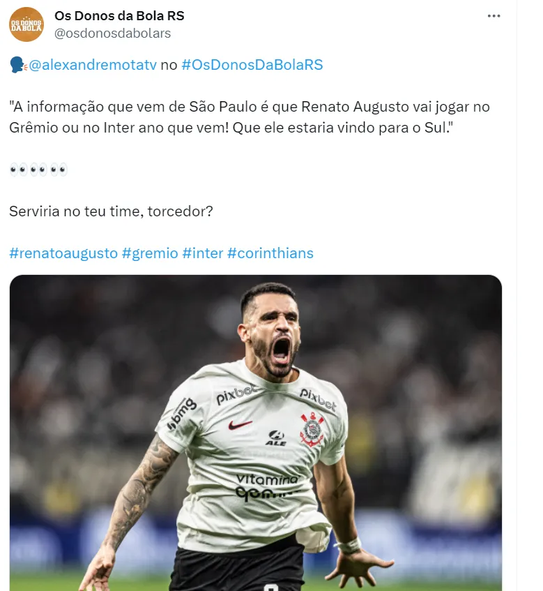 As aspas do jornalista é o seguinte: “A informação que vem de São Paulo é que Renato Augusto vai jogar no Grêmio ou no Inter ano que vem! Que ele estaria vindo para o Sul”, disse ele.