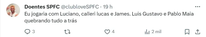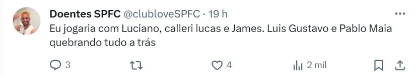 Vale lembrar que com Dorival os jogadores já chegaram a jogar juntos. Contra o Cuiabá, ano passado, pela 35ª rodada do Brasileirão, por exemplo, Luciano entrou mais como um centroavante e James fazendo o meio ofensivo com Lucas Moura e Michel Araújo.