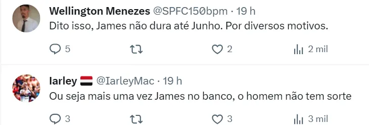 Com a informação, a torcida se manifestou nas redes sociais, já prevendo que James Rodríguez mais uma vez deve começar no banco. “Ou seja mais uma vez James no banco, o homem não tem sorte”, “Dito isso, James não dura até Junho. Por diversos motivos”, “Nosso mano James vai penar, viu”.