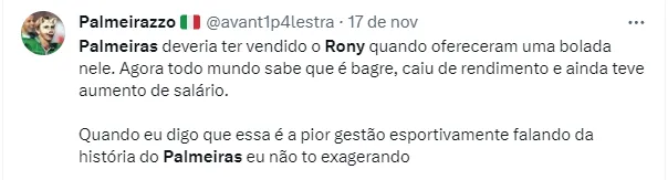 O jornalista ainda revelou que o Palmeiras já espera uma proposta do futebol árabe. A tendência é de que seja de um clube do Catar, país o qual Rony é muito bem avaliado.