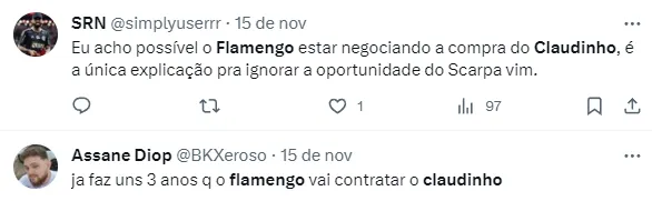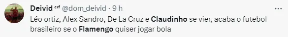 Fabrício ainda afirma que alguma parte certamente irá ceder e Claudinho, de fato, tende a se tornar jogador do Flamengo. O atleta, inclusive, já teria comunicado ao Zenit o desejo de voltar ao Brasil.