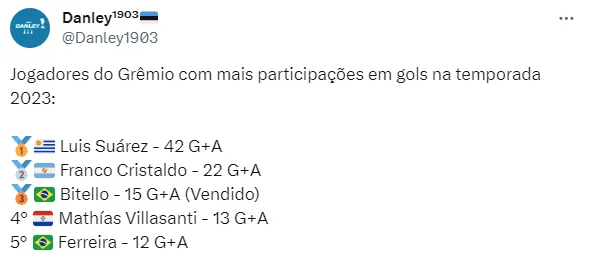 Luisito é o jogador com mais participações diretas em gols na atual edição do Brasileirão. São 14 tentos assinalados e passes para outros 10, totalizando envolvimento em 24 gols do Grêmio.