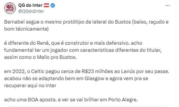 Isso porque, de acordo com o jornalista César Luis Merlo, o Internacional também acertou com o lateral-esquerdo Alexandro Bernabei, que vinha atuando pelo tradicional Celtic.