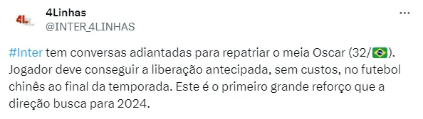 Com isso, o Inter pode acabar frustrando os planos do Flamengo, que tenta a contratação de Oscar desde a última temporada.