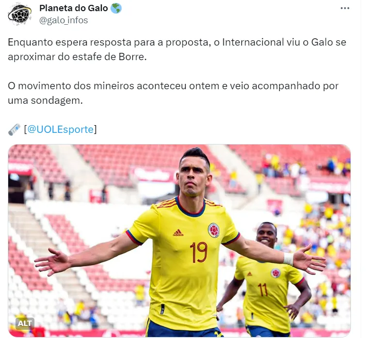 Agora, o nome de Borré teria se aproximado para se juntar a um rival do Internacional, o Atlético-MG, que teria se aproximado do staffe de Rafael Borré e, consequentemente, do atacante.