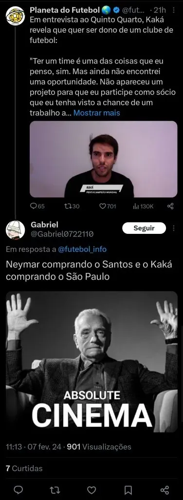 Kaká tem muito a contribuir com o futebol, principalmente somando passagens por equipes como São Paulo, Milan e Orlando City. A ver as cenas dos próximos capítulos e como o veterano vai conduzir isso. Ele brinca sobre investir em possível SAF do SPFC: “Já pensou?”, indaga o ex-atleta.