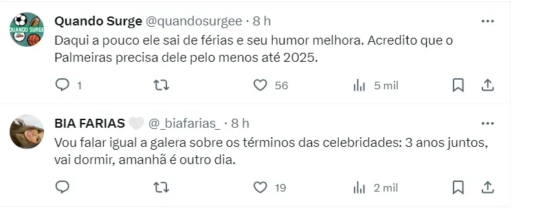 “Vou compreender totalmente caso ele não renove ao fim do contrato e vá descansar um pouco. Quatro anos no comando do Palmeiras desgastam até a saúde mental da Monja Coen”, continua o torcedor.