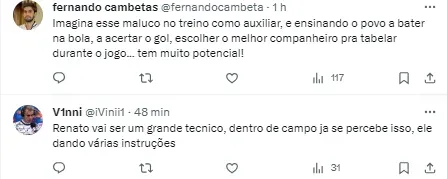 “Conversamos bastante, mas muito de jogo e de treino. É um cara que eu gosto muito de trocar ideia. Eu senti uma diferença da última vez que trabalhei com ele para agora. Ele está muito claro. Está bom de conversar. Ele sempre fala para mim: ‘Você que vai ser treinador, olha isso, pensa nisso’. Tenho trocado bastante informação com ele”. explicou Renato.