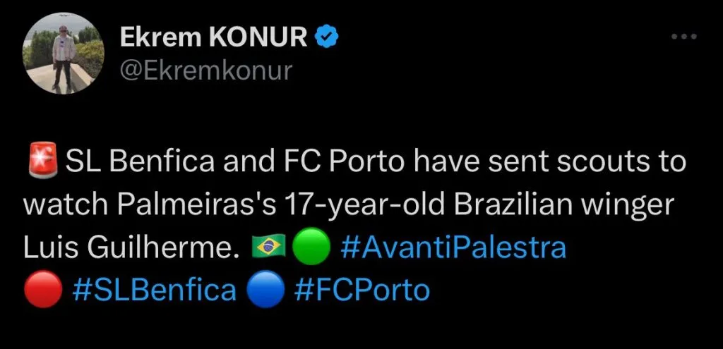 Segundo informações do jornalista Ekrem Konur, o Palmeiras pode perder o atacante Luis Guilherme em breve. Benfica e Porto demonstraram interesse na contratação do jogador de 17 anos.