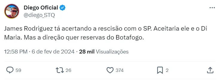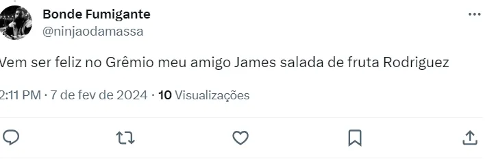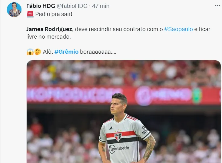 Na web, parte da torcida do Grêmio começa a se movimentar para uma possível chegada de James ao time de Porto Alegre. É bem verdade que o foco do Grêmio é encontrar um novo atacante, mas James é bem visto pela torcida.