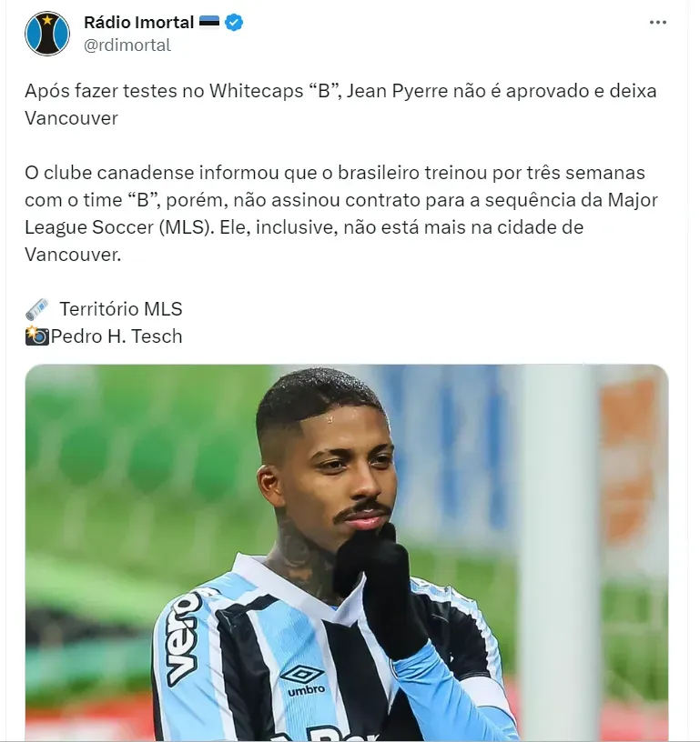 Desde que acertou sua rescisão de contrato com o Grêmio, que foi neste ano, de 2023, Jean Pyerre tenta voltar ao futebol de forma profissional, mas não será na MLS, uma vez que o atleta não conseguiu passar nos testes do Whitecaps, do Canadá, e que disputa a MLS, principal competição dos Estados Unidos. Na web, a torcida gremista não está perdoando seu ex-jogador.