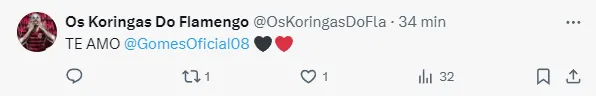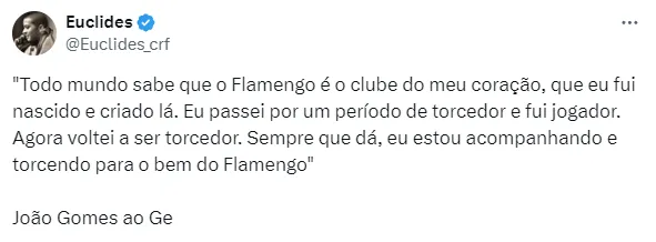Além disso, João Gomes afirmou acompanhar o Fla sempre que possível: “Eu passei por um período de torcedor e fui jogador. Agora voltei a ser torcedor. Sempre que dá, eu estou acompanhando e torcendo para o bem do Flamengo”