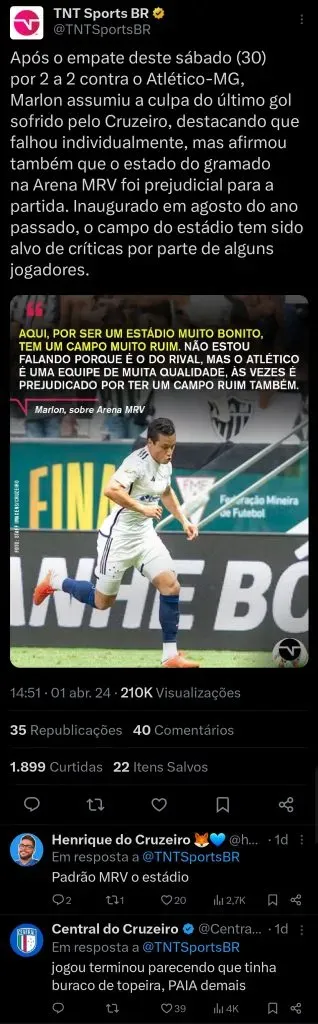 “Aqui, por ser um estádio muito bonito, tem um campo muito ruim. Não estou falando porque é o do rival”, disse o lateral em relação às vezes que defendeu o Cruzeiro na casa do arquirrival.