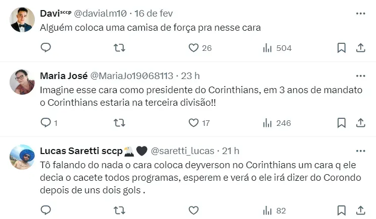 “Do jeito que o Deyverson jogou no Cuiabá, eu contrataria ele. É R$ 20 milhões a multa dele. O dinheiro que gastou com o Pedro Raul, que me desculpe ele, eu traria o Deyverson. É centroavante que tem a cara do Corinthians, ia cair como uma luva”, indica o jornalista.
