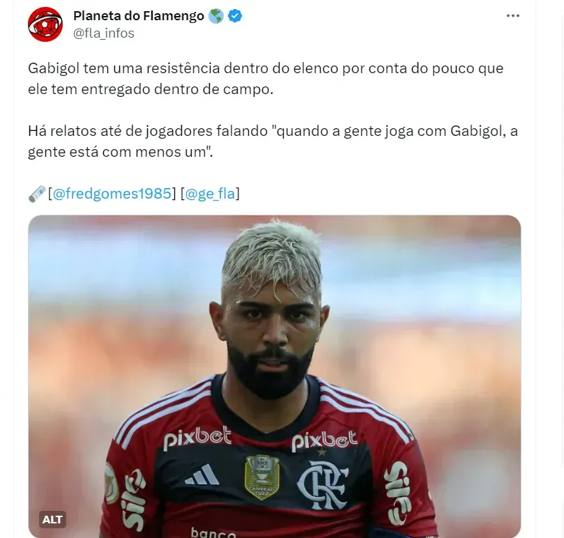 De acordo com informações do GE, há fortes relatos sobre alguns jogadores do Flamengo que não confiam no futebol de Gabriel Barbosa, devido ao fato de que o camisa 10 vem entregando pouco dentro de campo. “Quando a gente joga com Gabigol, a gente está com menos um”, teriam dito um ou mais jogadores, sobre Gabigol. Os nomes, no entanto, não foram revelados.