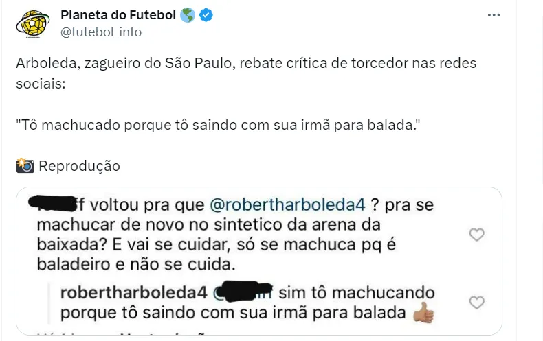 A discussão nas redes sociais entre o zagueiro Arboleda e um torcedor do São Paulo parece ter envolvido provocações e respostas ásperas. Arboleda respondeu de forma provocativa, mencionando que estava “saindo com sua irmã para a balada”.