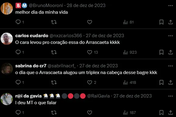 “O Carlinhos é o quê? Lembra do Felipe? O Carlinhos rabisca. Arrascaeta lê o quê? Ele não rabisca. Ele tem um passe muito bom, dá umas achadas e faz uns gols bonitos”, acrescentou.