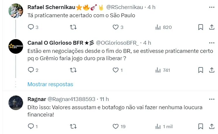 O São Paulo é, ainda, o maior interessado e o clube mais próximo de Ferreirinha, mas pode ver o Botafogo ultrapassá-lo no negócio envolvendo o Grêmio. De toda forma, o Tricolor confia na vontade do atleta em ir para o futebol paulista.