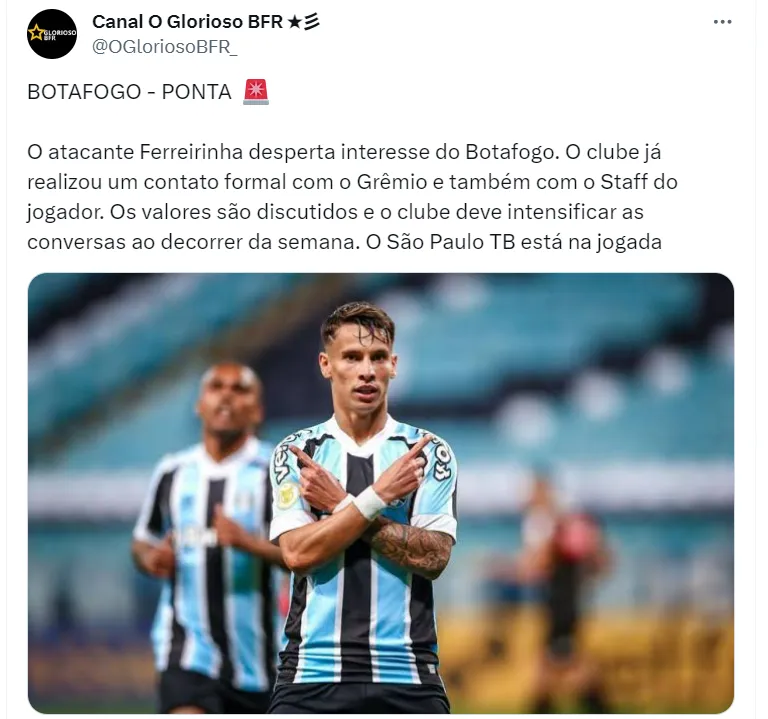 O Botafogo é o mais novo interessado em Ferreirinha e se junta a São Paulo e Corinthians. O Glorioso está à caça de jogadores para a Libertadores e teria feito um contato formal diante do atacante gremista.