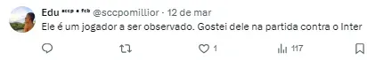 Com a atuação, a torcida do Corinthians já se animou com o jogador que vem se destacando nas categorias de base e agora foi inscrito na Sul-Americana. Ele ainda não marcou gols, mas tem se mostrado peça importante na equipe com boas jogadas individuais, inteligência e drible.