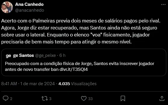 O Palmeiras está pagando integralmente os salários de Jorge, mas o combinado venceu em fevereiro. Como o atleta está sem condições de jogo, o Peixe trabalha para ampliar esse acordo.
