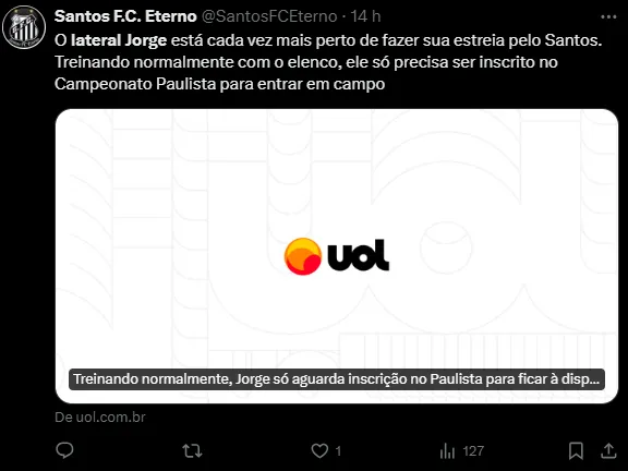 Jorge não aparece no BID e tampouco está inscrito no Paulistão pelo Santos, que sofre sério risco de ser notificado por um novo transfer ban da FIFA. Vale lembrar que o time acabou de sair de um e resolveu a situação com Fabián Bastos para ficar livre.