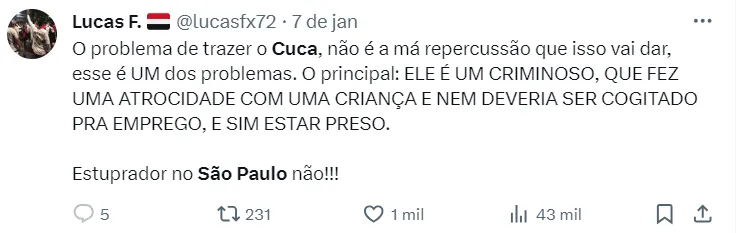Cuca, ex-Corinthians e, hoje, livre no mercado, é um nome que vem sendo bastante pedido por parte da torcida do São Paulo nas redes sociais, uma vez que, recentemente, ele foi declarado inocente em um caso na Suíça, segundo informações do jornal O Tempo.
